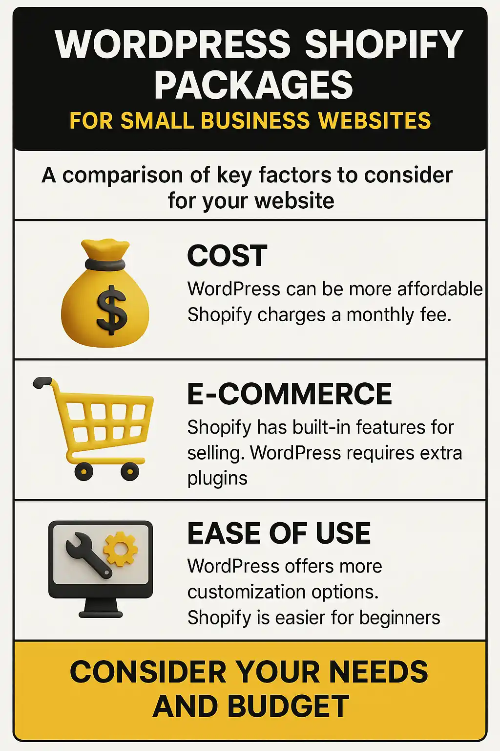 When deciding between WordPress and Shopify packages for your small business website, it helps to focus on your priorities: customization, ease of use, and eCommerce needs.